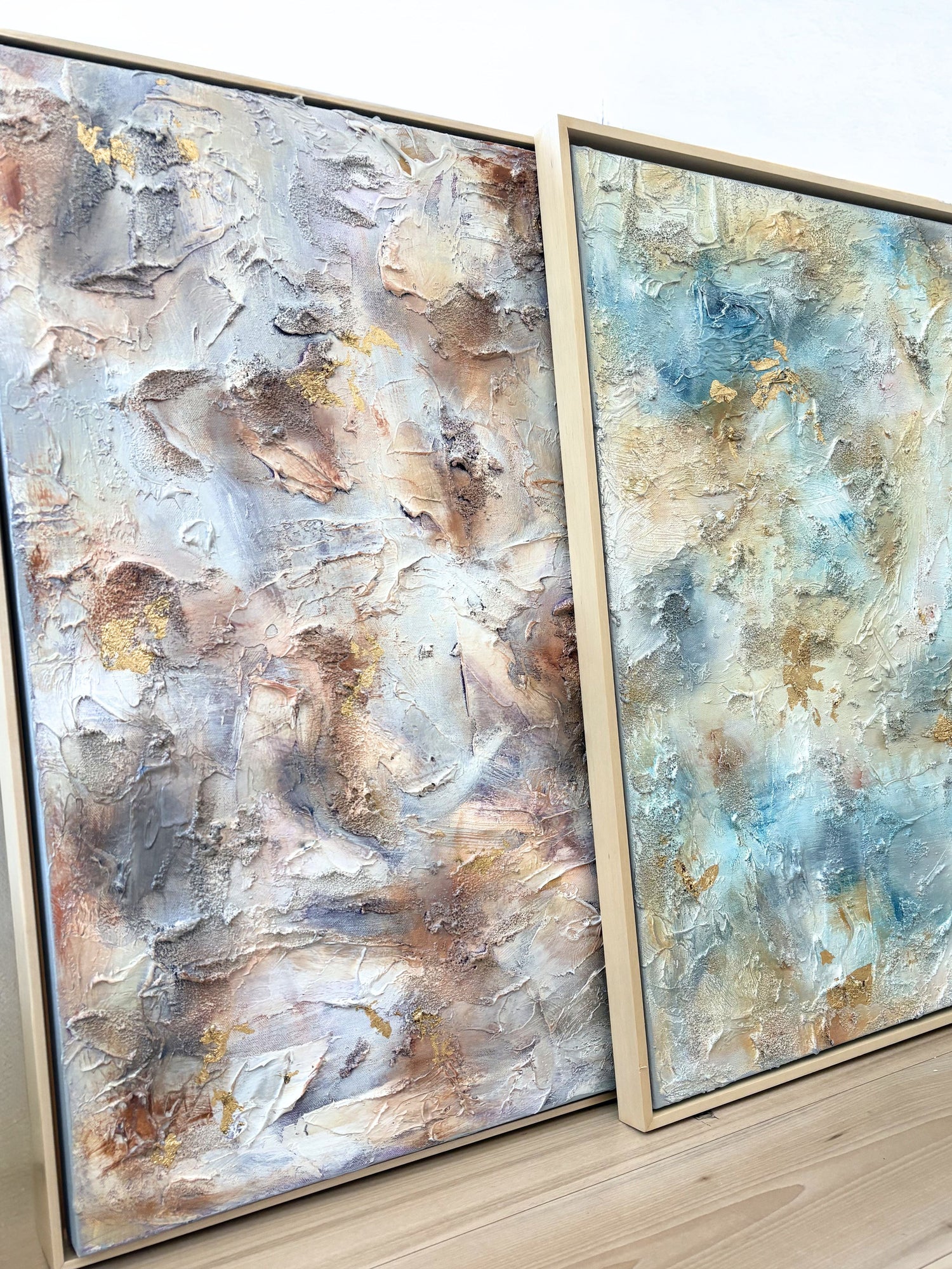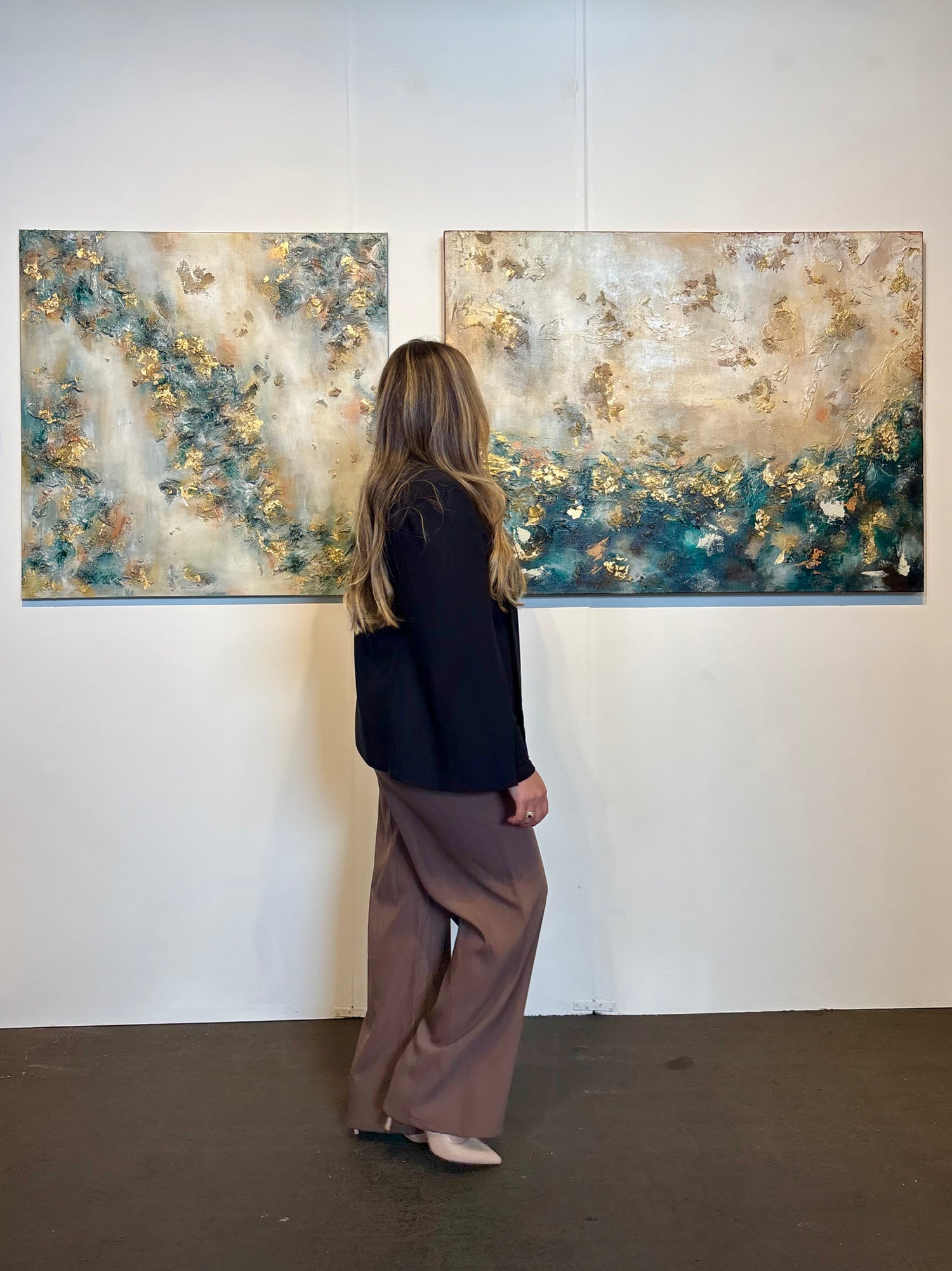 Soft fields of color blend seamlessly across textured surfaces, while traces of gold catch and hold the eye—like fleeting moments of illumination. The works unfold slowly, revealing themselves through subtle shifts rather than bold contrasts.